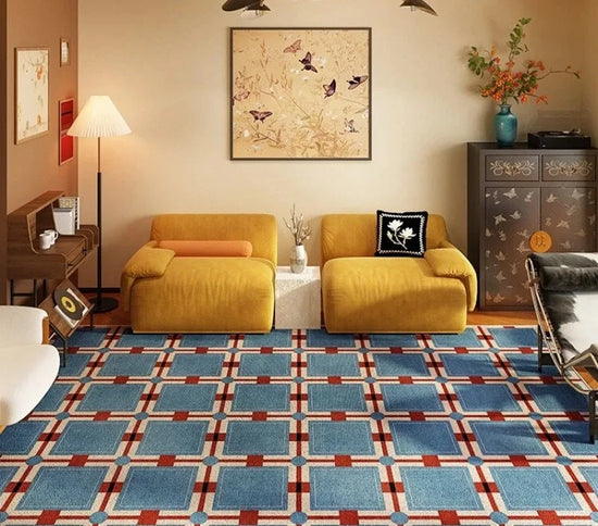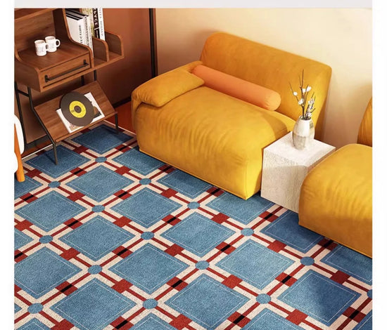 Tapis rétro à carreaux bleu pour salon ou salle à manger